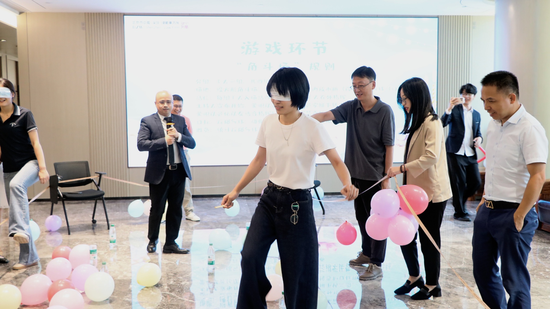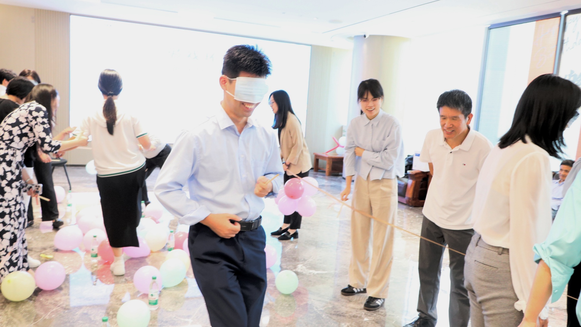 游戏开始后,蒙眼队员先转三圈,再依靠队友的指引行动。现场笑料频出:有的队员小心翼翼缓慢摸索,有的则大胆出击;场外指挥急得手舞足蹈,围观同事笑声此起彼伏。最终根据踩爆气球的数量决出胜负,优胜小组获得了精美奖品。